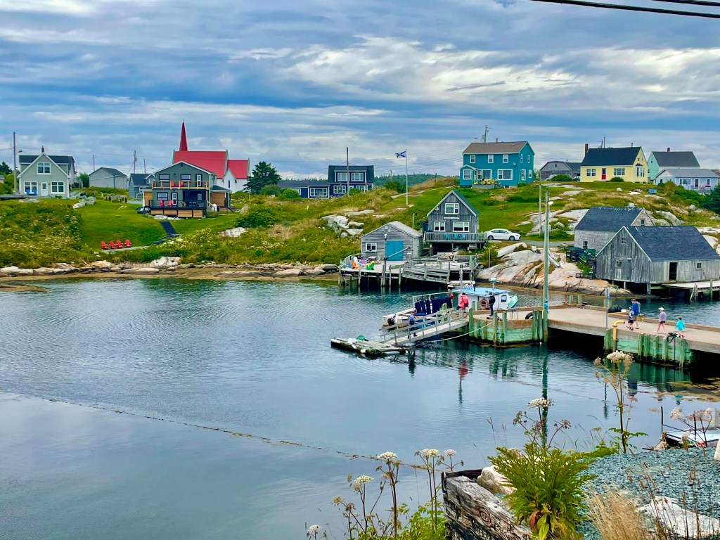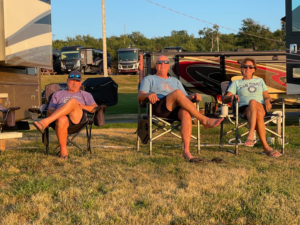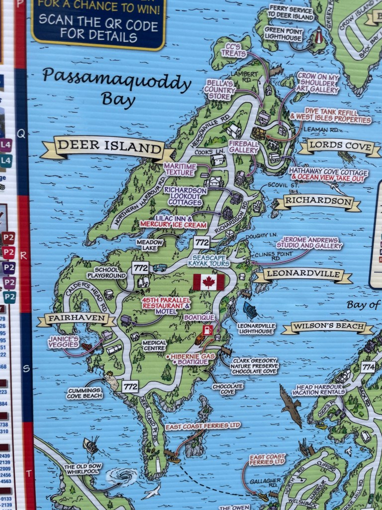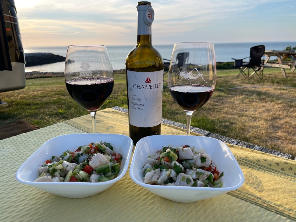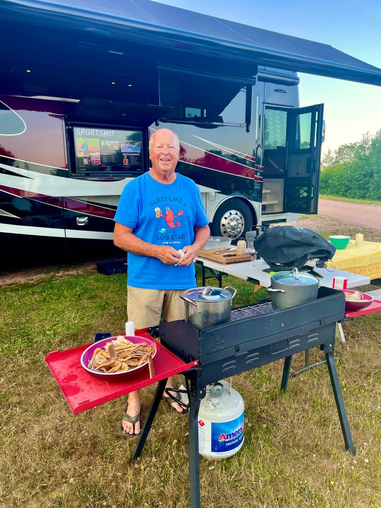 On the drive from St. Andrews to Parker’s Cove, we stopped at the famous Reversing Falls Rapids viewing platform and visitor’s center. When the tides change, the water flows up river and creates big waves. It was foggy the day we went but could still see the water. This is one of Atlantic Canada’s natural wonders. We drove to the ferry terminal and took the ferry from St. John to Digby. It was a 2 1/2 hour ride on the open water seeing birds, ships and just enjoying being on the big boat. Pretty cool taking the big bus towing the car on the ferry, we were second on next to a semi truck and that made for a quick exit when we arrived in Digby. BTW, this saved us a 7 hour drive around the island to get to Parker’s Cove. Checked into the Cove Oceanfront Campground, got set up and enjoyed terrific sunrise and sunset views from our site. A small harbor next store provide Ron and I a chance to visit and speak to the crews about lobster and scollop fishing. Digby is known to have the best scallops in the world. Lunch at the Crow’s Nest did not disappoint, the clam chowder was fantastic, mussels, lobster roll were equally as good. MMT for the afternoon exploring the island and finding a lobster / scallop pound that we were able to buy some fresh scallops. WOW, they were fantastic. We made scallop ceviche for dinner with a nice bottle of wine made for a great evening. A round of golf at Fort View Golf Course, lunch at Frank and Dora’s Roadside Cafe was a perfect way to to end our stay in Parker’s Cove.