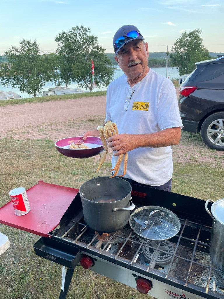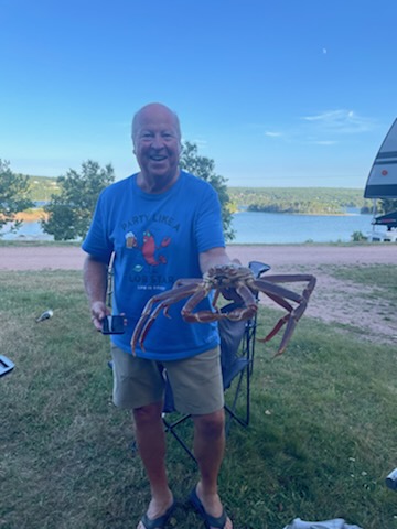 Cape Breton is the furthist East we will be traveling on this journey, it’s on the Northeast corner of Nava Scotia. This area is know for their famous Cabot Trail, a 293 KM trail that loops around the island with spectacular views from high atop Kelly’s mountain. Beautiful beaches, harbors, small towns, restaurants and blue water all along the trail. We stopped at the Hideaway Campground and Oyster Market because it just sounded intriguing. Who knew there would be an oyster bar out in the middle of these little mountain towns. Oysters and beer for Ron and Glenna while Kathy and I enjoyed just the oysters ( I was the driver). Long day on the road but well worth the time spent exploring the trail. We found a very small harbor with a couple of crab boats coming into the dock to offload their catch of the day. Of course we talked to the captain about their catch and we were able to buy Snow Crabs right off the boat. We took them back to the RV, cleaned them and cooked these great tasting creatures. WOW, they were delicious. I think Glenna and Kathy might call this a highlite of the trip, they really love eating fresh crab. Glenna and I played golf at the Seaview CC with lots of water views and overall a beautiful course.