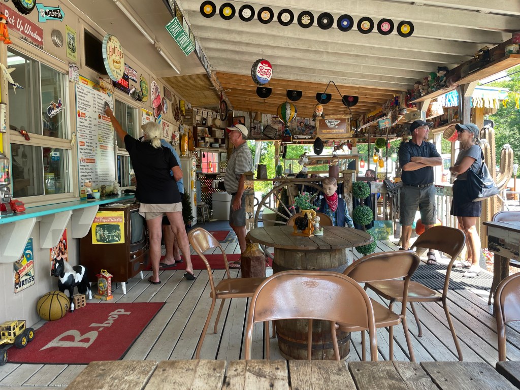 Plenty of MMT (magical mystery tour ) while in Bar Harbor. A super fun trip over to Deer Isle crossing the 1939 suspension bridge and driving around the island. The small town of Stonnington at the far end eastern point had little shops, restaurants and a working fishing marina with lots of activity. Lobster boats, sight seeing tours and private boats filled the waters. We went to the Granite museum and watched a film on how they mined the granite back in the 1800’s was pretty cool, what a life they had to live to survive. Small snack in town at Stonnington Lobster Roll, Glenna and I split a smoked Haddock fish sandwich which was delishous then back on the road exploring. We hit the famous Nervous Nelly’s Jam and Jellies tourist trap, hard to explain this outside art showplace but worth the stop. Our dinner spot was at Perry’s Lobster Pound on the mainland near Blue Hill. Right on the water provided a beautiful place for outside dinner. Ron, Kathy, Scott, Beth, Glenna and I enjoyed lobsters, seafood salads and since it was a BYOB, we had some good wine to share. Surprised to find a very well stocked wine store in Blue Hill. Back to the RV for a final final with Scott and Beth, said our good bye’s because they left for the next part of their journey on Sunday. Mike and Judy left on Saturday morning heading to Boston for one night then back to San Diego. We spent the last two days enjoying our water views, picking up some oysters (we are getting a lot better at shucking these little suckers) for our final night and getting ready to cross the border and start our journey on the Canadian Maritime Trail for the next 5 weeks.