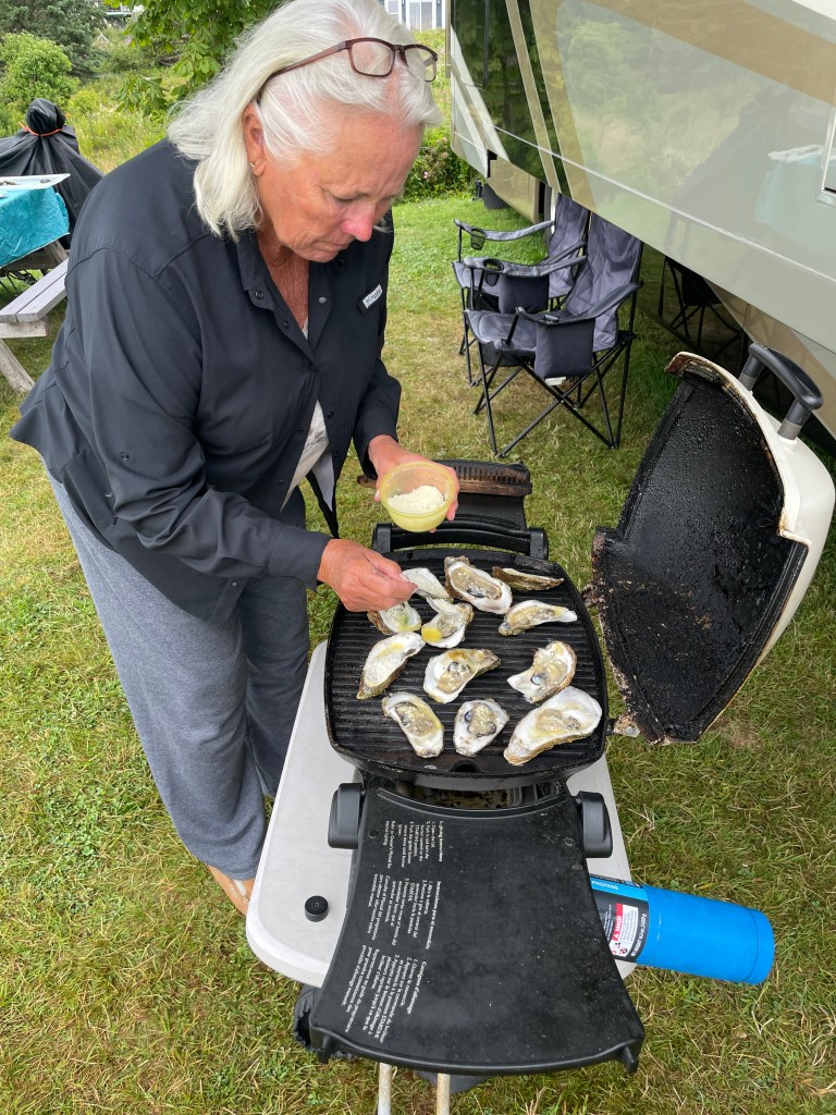 Ron found us a great place to buy fresh oysters on the island. The Bar Harbor Oyster Company was the place to get our fill of the local oysters for the entire two week stay. This guy operated out of his garage, building his oyster bed cages and selling oysters along with some murchandise. You picked out your oysters, put your money in his cash drawer all on the honor system while Jessie was out working the beds. We could see his oyster beds from our RV site out on the bay in front of us. We had fun shucking them, eating some raw and some made it to the BBQ with a variety of different sauces. All were delicious but the crowd favorite was the BBQ with butter, garlic, parmesan cheese and a little panco over the top. Pat made a batch of strawberry daiquiris and we sat out enjoying the afternoon and the great view.
