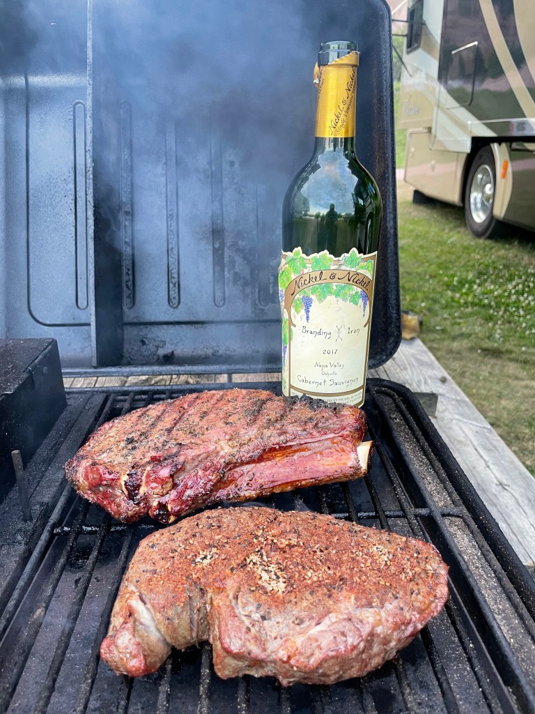 Scott, Beth, Mike and Judy were staying in a small hotel in Bar Harbor. Nice rooms and a great place for us to park while joining them on our site seeing trips. We did a walking history tour of BH one afternoon then followed up by checking out the bar at the BH Hotel. It was perfect, 8 seats at the bar and fun bartenders to provide us with well needed refreshments. Some us had a Blueberry Jalapeño margarita that was quite spicy while others had wine, beer and mixed coctails. Two rounds and out made for a fun time catching up with good friends. Friday evening had perfect weather for our Sunset sailing cruise aboard the Margaret Todd Schooner. This 151 foot schooner is the only 4 mast sailing ship in New England. Out aound the Bay seeing seals, birds, small islands, lobster traps and a spectacular sunset. Judy found us a great outbar to have a night cap with the team sitting around a fire drinking thier favorite cocktails. On Thursday night, the Huth’s and Fawcett’s hosted the Vaughan’s and MacKenzie’s at the RV for a pre-retirement dinner party for Mike and Judy. It was a gorgeous night and we sat outside enjoying oysters on the half shell both raw and hot on the BBQ. Kathy made delishous pork tenderlion and we added corn on the cob, charcuterie board and of course some great wines. Rombaurer and Silver Oak for Judy and Sherwin Family Vinyards for Beth, Coors Light for Mike made him happy.